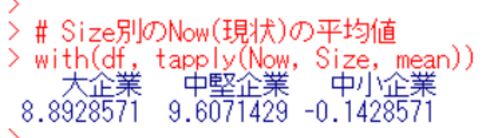 www.crosshyou.info の続きです。 今回は、企業の規模、大企業、中堅企業、中小企業の3つの企業規模で短観の値に違いがあるのかどうか、ANOVA(ANalyis Of VAriance)をしてみます。 まずは、現状(Now)のそれぞれの平均値を見てみましょう。tapply関数とmean…