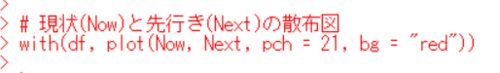 www.crosshyou.info の続きです。 今回は、現状と先行きで回帰分析をしてみようと思います。 先行きを反応変数、現状を説明変数にしてみます。 まずは、plot関数で散布図を描いてみましょう。 右肩上がりの散布図です。現状(Now)と先行き(Next)には正の相関…