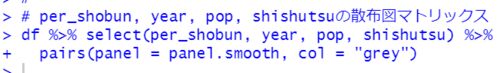 www.crosshyou.info の続きです。 今回はR言語のlm関数を使って、単回帰分析と多項式線形回帰分析をしてみます。 まずは、変数同士の散布図をみてみます。 相関係数マトリックスもみてみます。 per_shobun: 食品営業施設当たりの処分件数と一番相関の強いの…