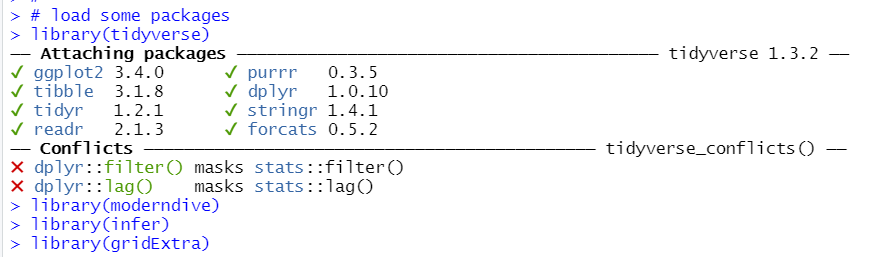 I loaded tidyvese, moderndive, infer and gridExtra packages. tidyverse is de-facto standard package in R for data science. I load moderndive package and infer package because I am learning Statistical Inference via Data Science (moderndive.com)