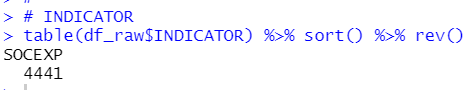 INDICATOR has no variation, has just one value, SOCEXP. So, I will remove INDICATOR.