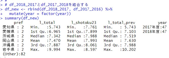 新しいdf_newというデータフレームができました。年度は、2017年度と2018年度だけです。2016年度は、前年度のl_totalがありませんので当然ですね。