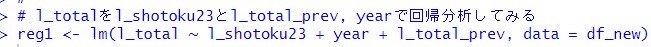 なんと、前年度のl_totalを説明変数に加えると、l_shotoku23はp値は0.164となりました。係数は0.41444ですが、統計的に有意とは言えないです。