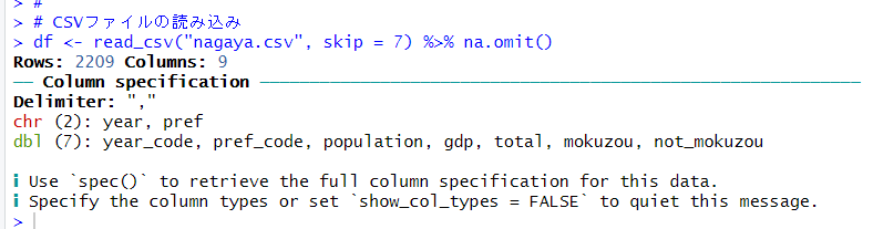 year_codeはyearと同じなので必要なし、pref_codeはprefと同じなので必要なし、yearとprefは文字列ですので、この2つはファクター型に変更します。