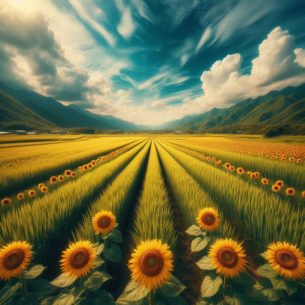 Generated by Bing Image Creatpr: Wide large view of rice fields in the summer, blue sky and sunflower
