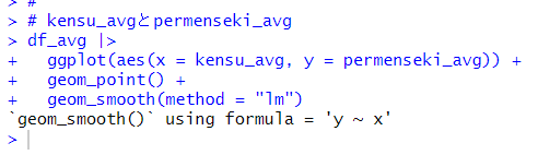 件数の平均値と1件当たりの面積の平均値の散布図を描いてみます。