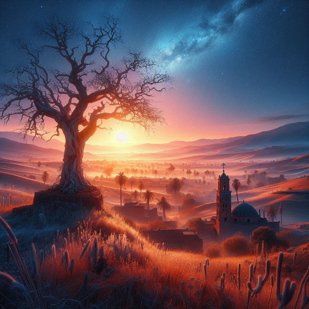 Generated by Bing Image Creator: last sunshine landscape of Morocco blue sky, photo