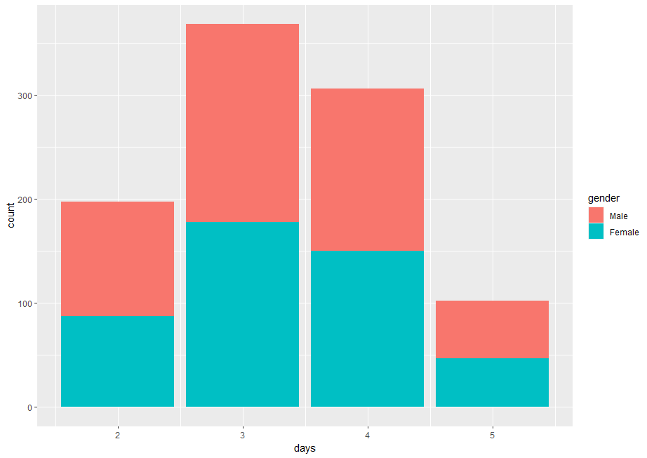 ggplot(gym_raw, aes(x = days, fill = gender)) +